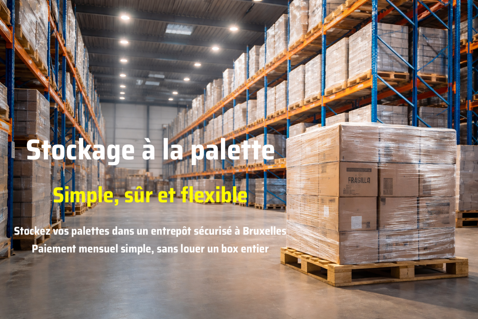 Notre solution de stockage palette à Bruxelles permet de stocker vos biens dans un entrepôt sécurisé, sans louer un box entier.
